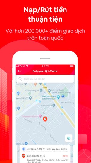 – Mạng lưới hơn 200.000 điểm giao dịch bao gồm: các cửa hàng, bưu cục, siêu thị Viettel, nhân viên bán hàng tại địa bàn tỉnh và các đối tác liên kết khác (lớn gấp 10 lần tổng số ATM trên cả nước).