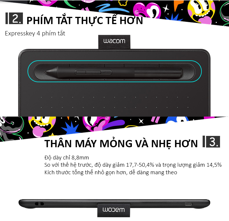 Thiết kế màn hình 7 inch, bạn có thể thoải mái vẽ và sáng tạo ý tưởng như trên giấy trắng. Trên bảng vẽ Wacom còn được thiết kế với 4 nút chức năng ExpressKeys™ có thể tuỳ chỉnh dễ dàng giúp cho trải nghiệm làm việc và học tập của người dùng trở nên tiện lợi hơn.
